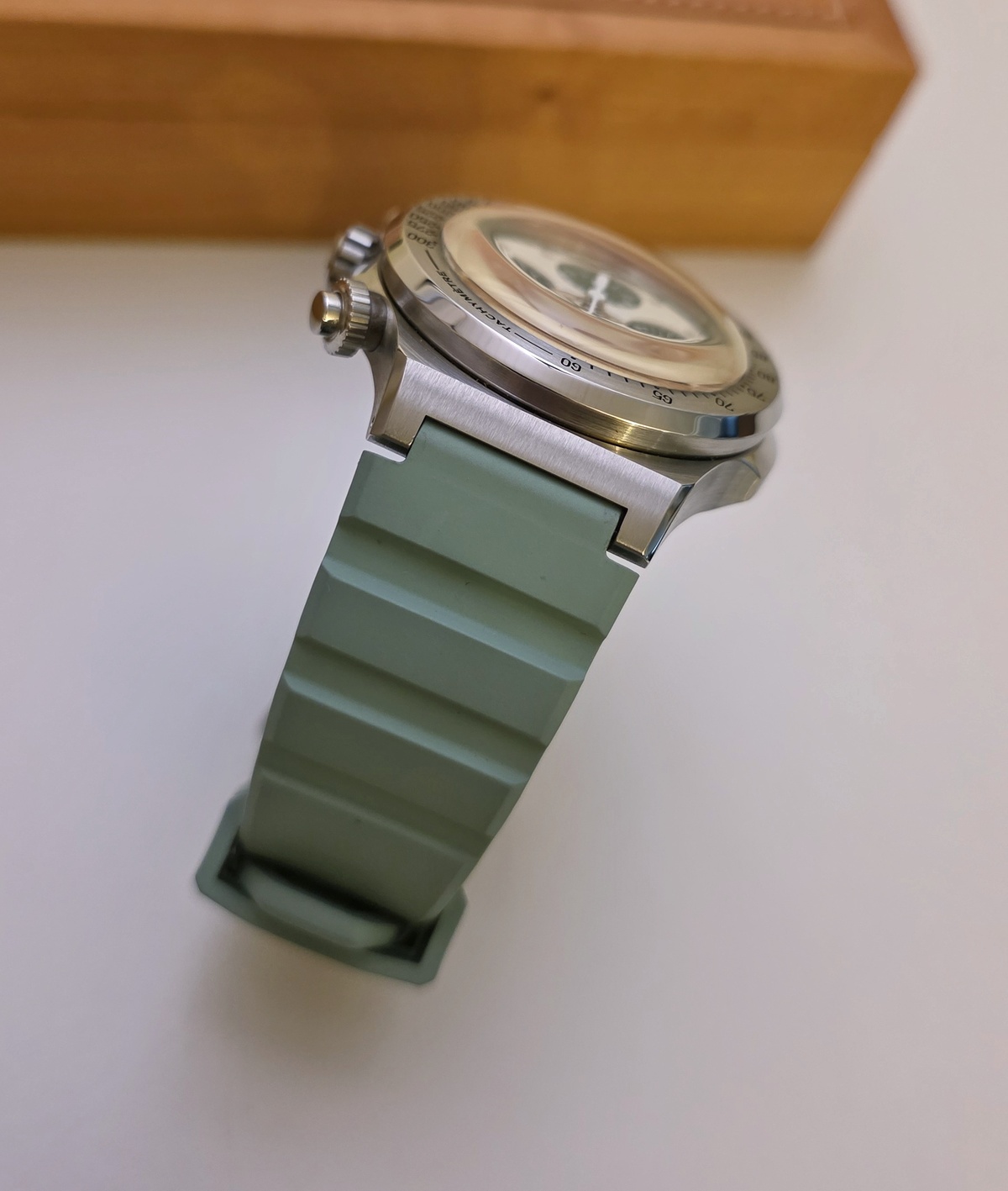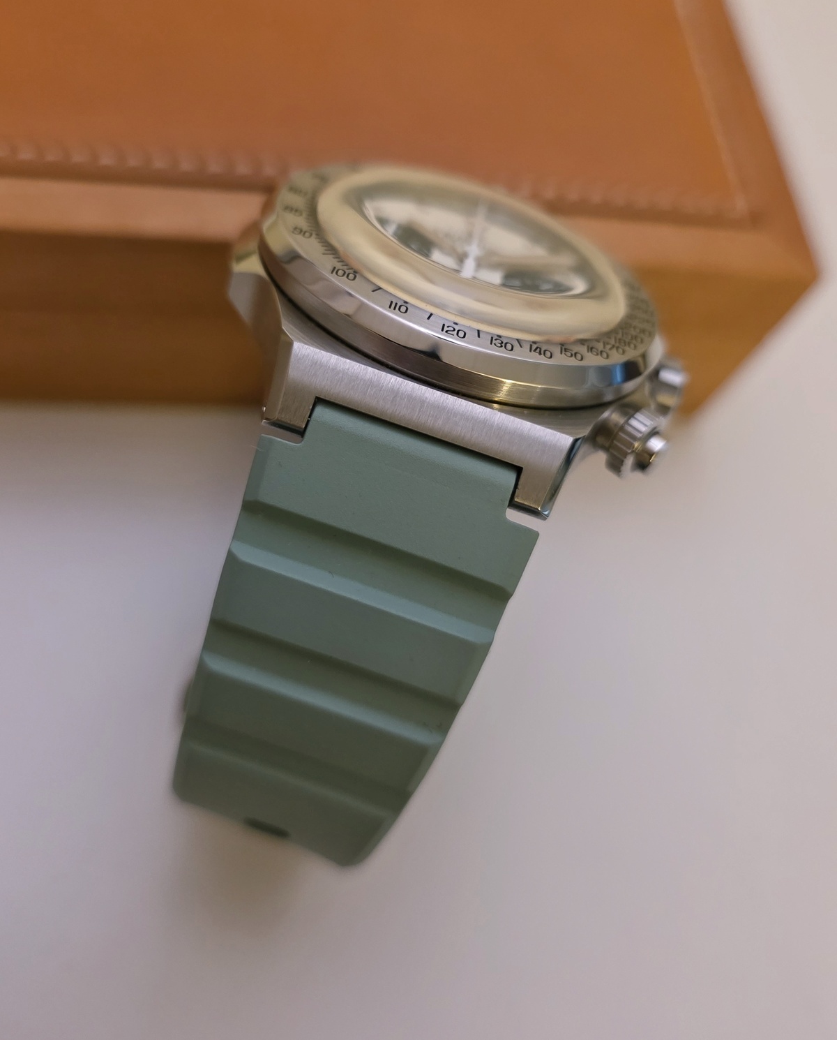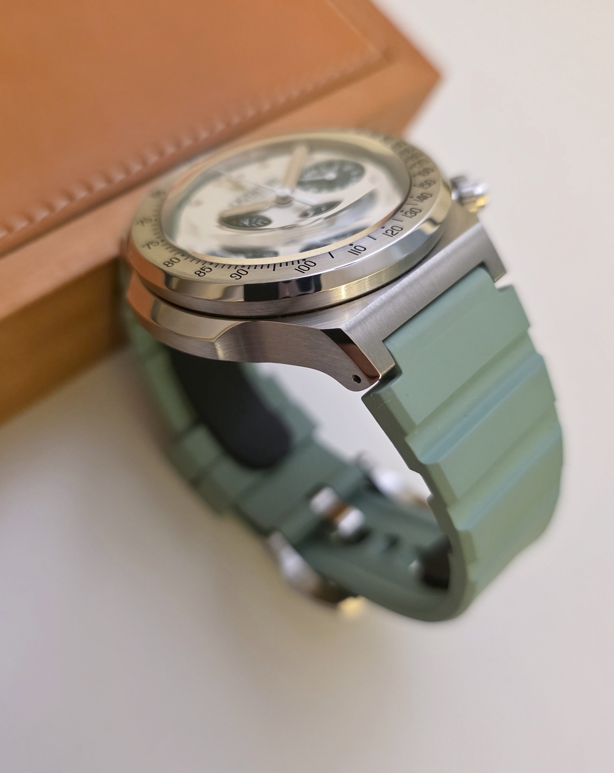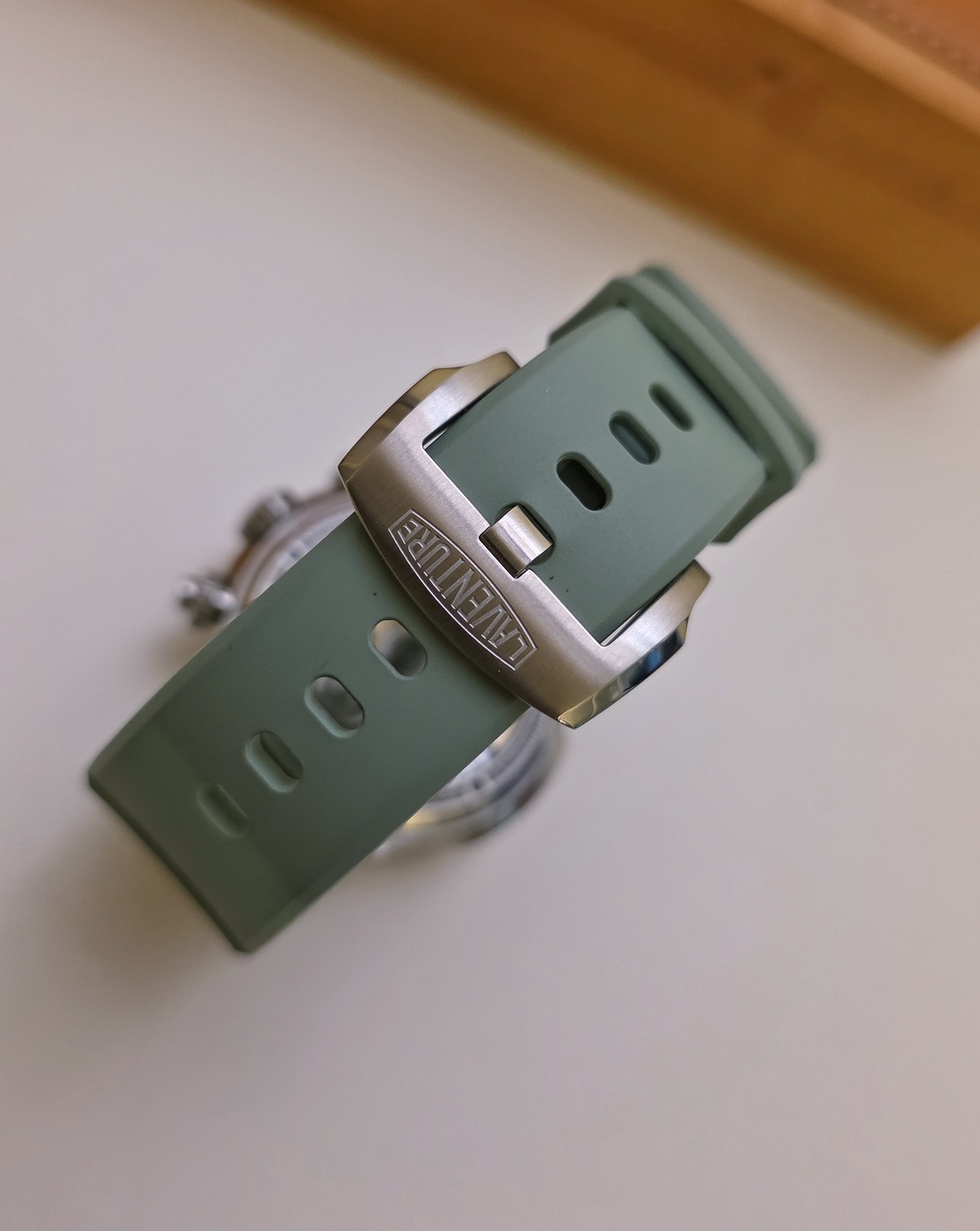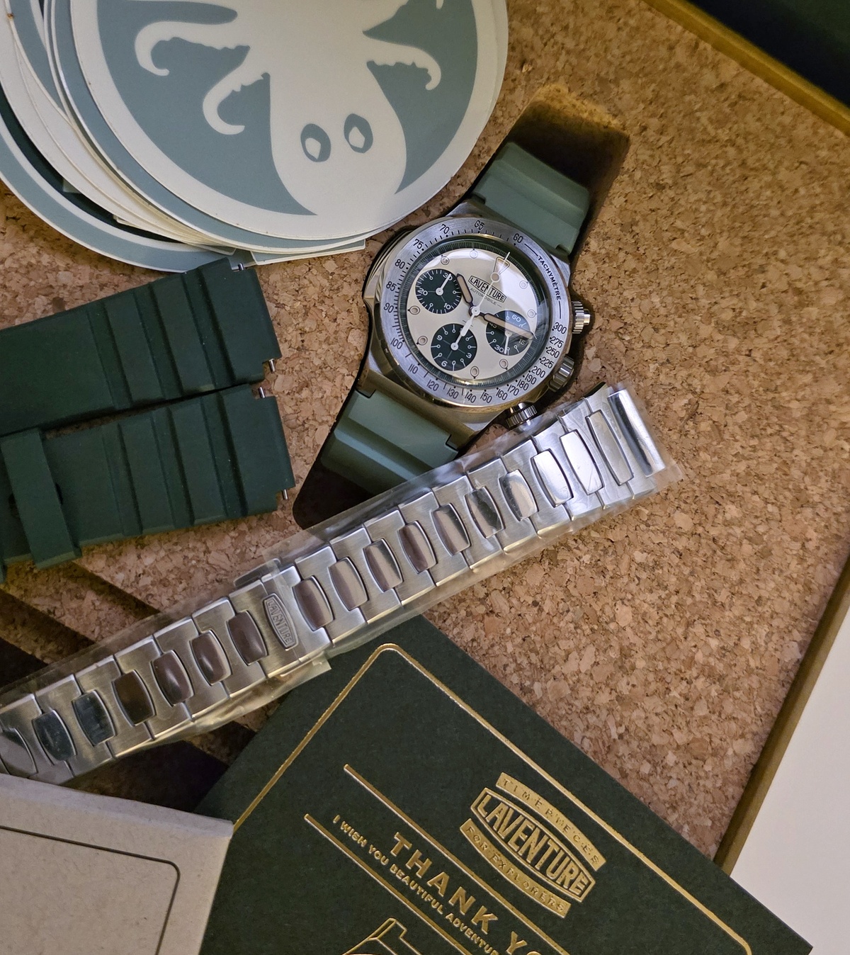 Elle dispose donc du bracelet intégré acier (jamais porté) ainsi que de deux bracelets « rubber » vert.