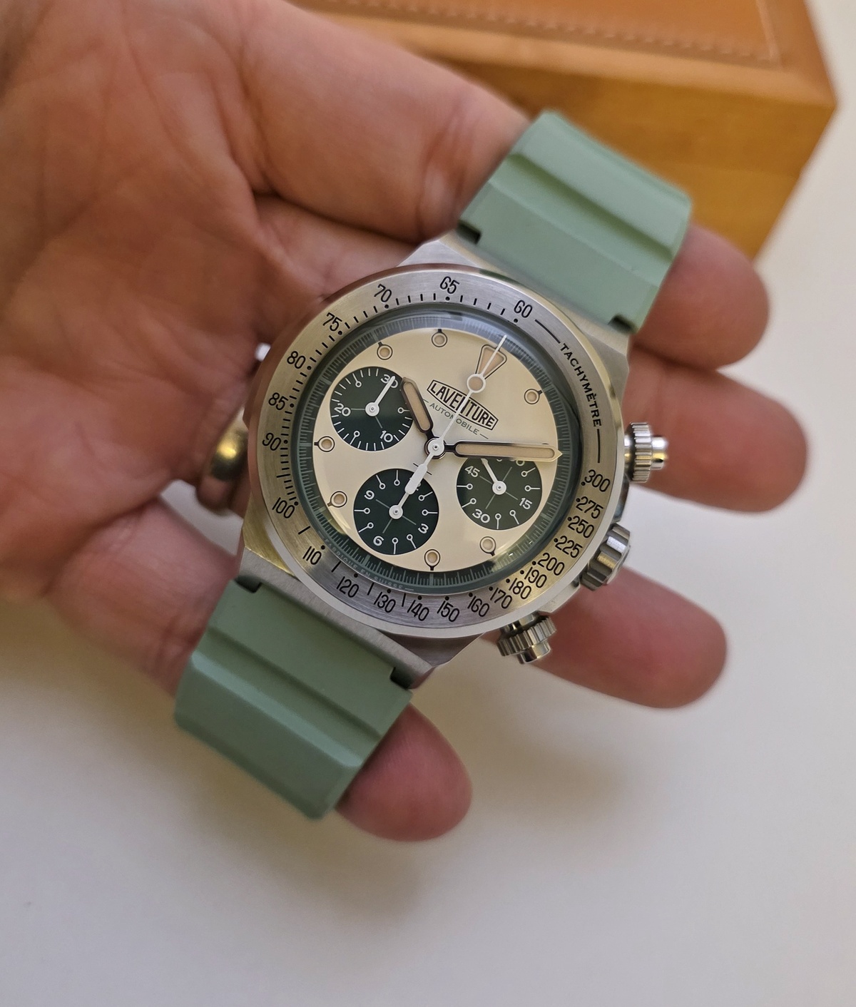 Ici le modèle Automobile dans sa version au cadran « sandwich » crème. Elle proposée full set (de son premier propriétaire).