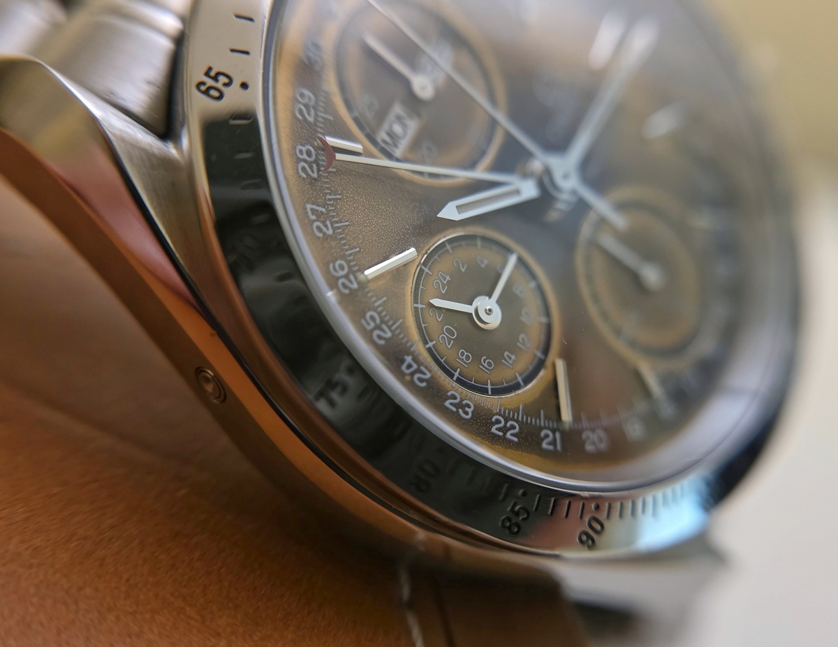 An interesting configuration with an automatic Omega 1150 movement (Valjoux 7751 base).